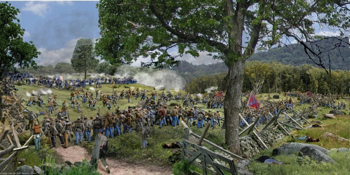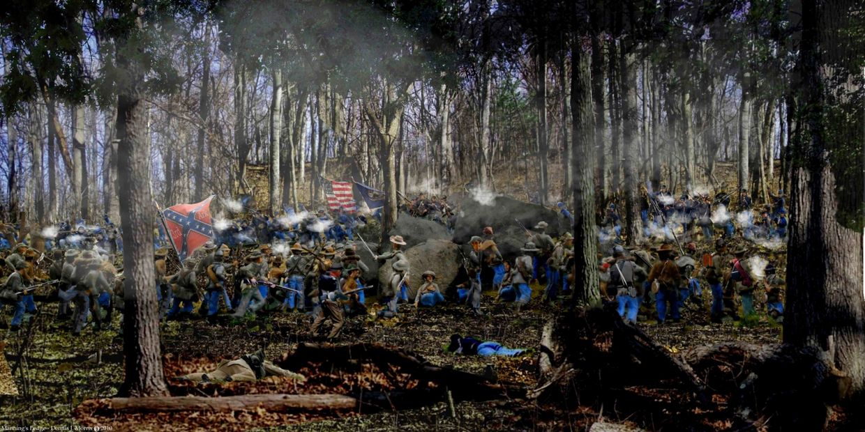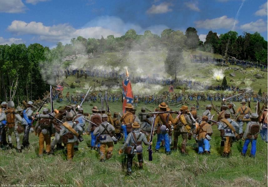 Here we see 3rd Arkansas at the ledge at about the midpoint of the battle. Colonel Manning is in the center directing the advance. The Union forces in the smoky distance are the 20th Indiana and the 86th New York. These units took over 250 casualties from their 650 men who fought that day in Rose Woods.