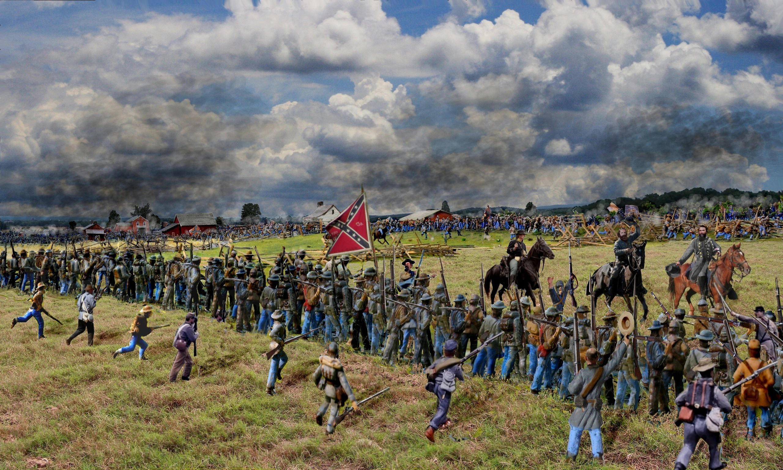 Here we see the 17th Mississippi approaching Trostle lane. General Barksdale is directing the 17th to move north. In the center background the Zouaves of 73rd N.Y. attempt to move from their earlier position in the Peach Orchard to rejoin the rest of the Excelsior Brigade. The 13th Mississippi is in front of the Sherfy house pushing back the 57th and 105th Pa. and the 18th Mississippi is out of view preparing to cross the Emmitsburg Road. In the far-right background is the Spangler Farm.