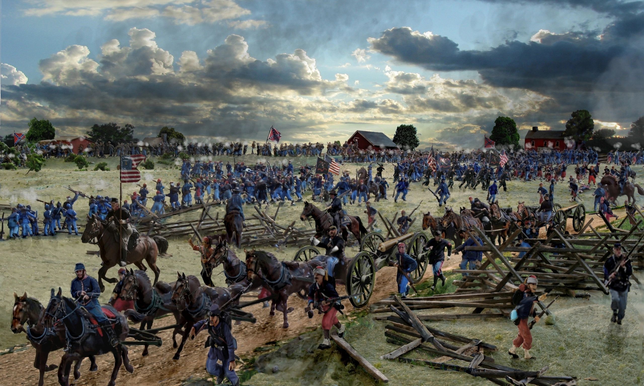 The scene above shows two Napoleon cannon of Bucklyn’s 1st Rhode Island Battery E retreating down Trostle Lane (now U.S. Avenue). That Battery was originally posted on the Emmitsburg Road to the left of the red Sherfy Barn in the center background. They only barely escaped form that position due to a heroic charge by the 114th Pa. Union infantry pictured from the left are elements of the 68th Pa., the red hat Zouaves of the 73rd N.Y., the 141st Pa., the red legged 114thPa., and the 57th Pa. The Confederate regiments of Barksdale’s Brigade visible from right to left are the 13th , 17th and 21stMississippi.
