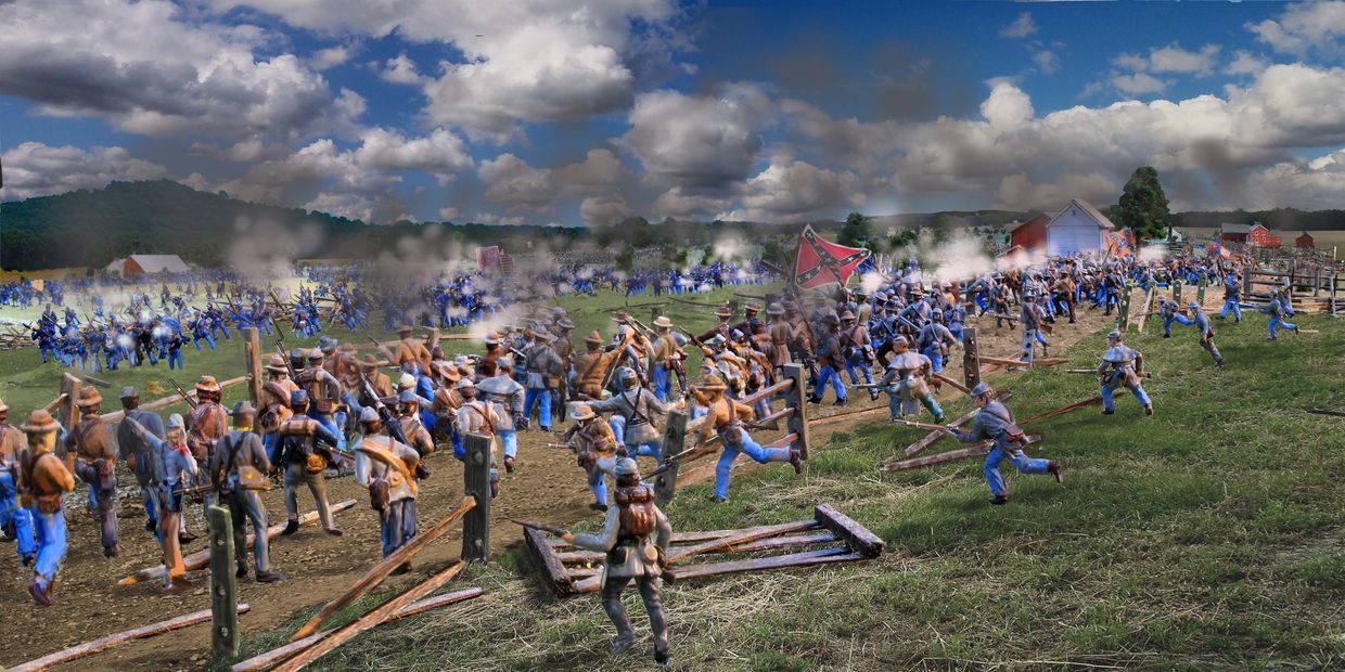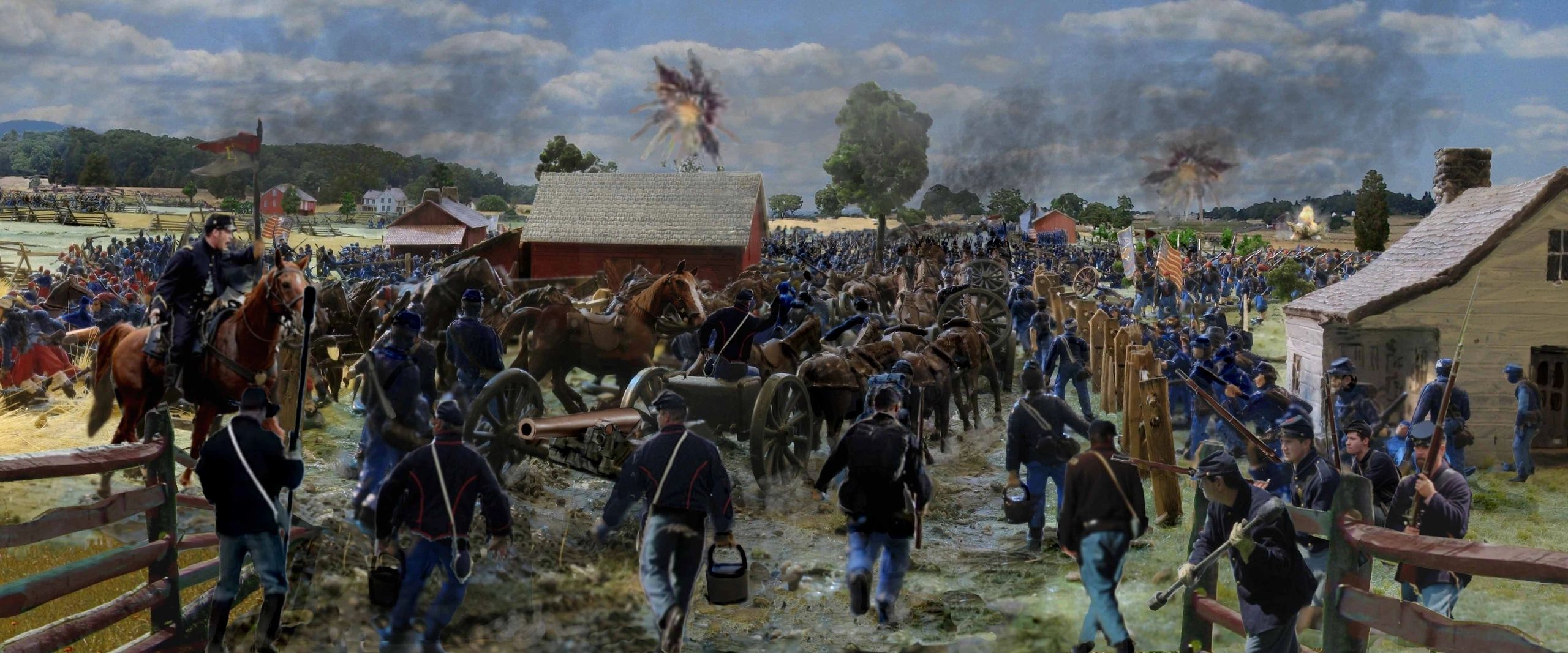Behind the Zouaves is the small log house of John Wentz. Wentz refused to leave his home when it became the center of nearly 40 Union Cannons. He remained there during 3 ½ hours of constant shelling. Amazingly the Ordnance Sergeant of one of the Confederate batteries focused directly on the area, was Henry Wentz, son of John Wentz. When the battle ended Henry ran into the house and found his father sleeping in the cellar.