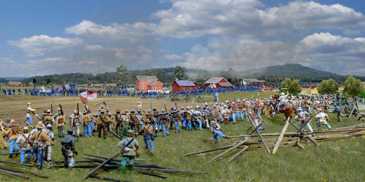 Later in the afternoon Wilcox joined Longstreet’s eight brigades in precise echelon sequence. Here we see the 14th Alabama crossing the yard of the Spangler house. In view behind are the 11th Alabama just south of Spangler Lane and the 10th Alabama further south. Also to the south is the Staub house and barn and smoke from confederate batteries located on Warfield ridge.